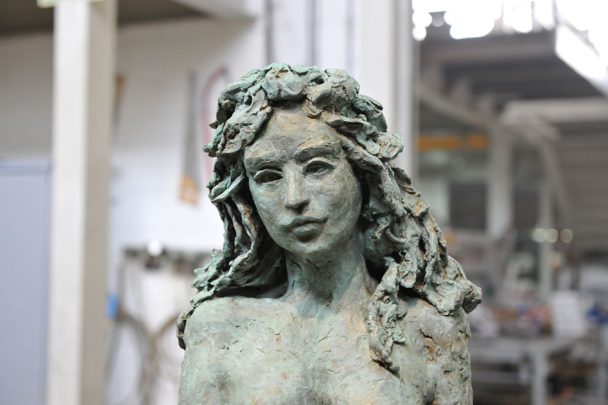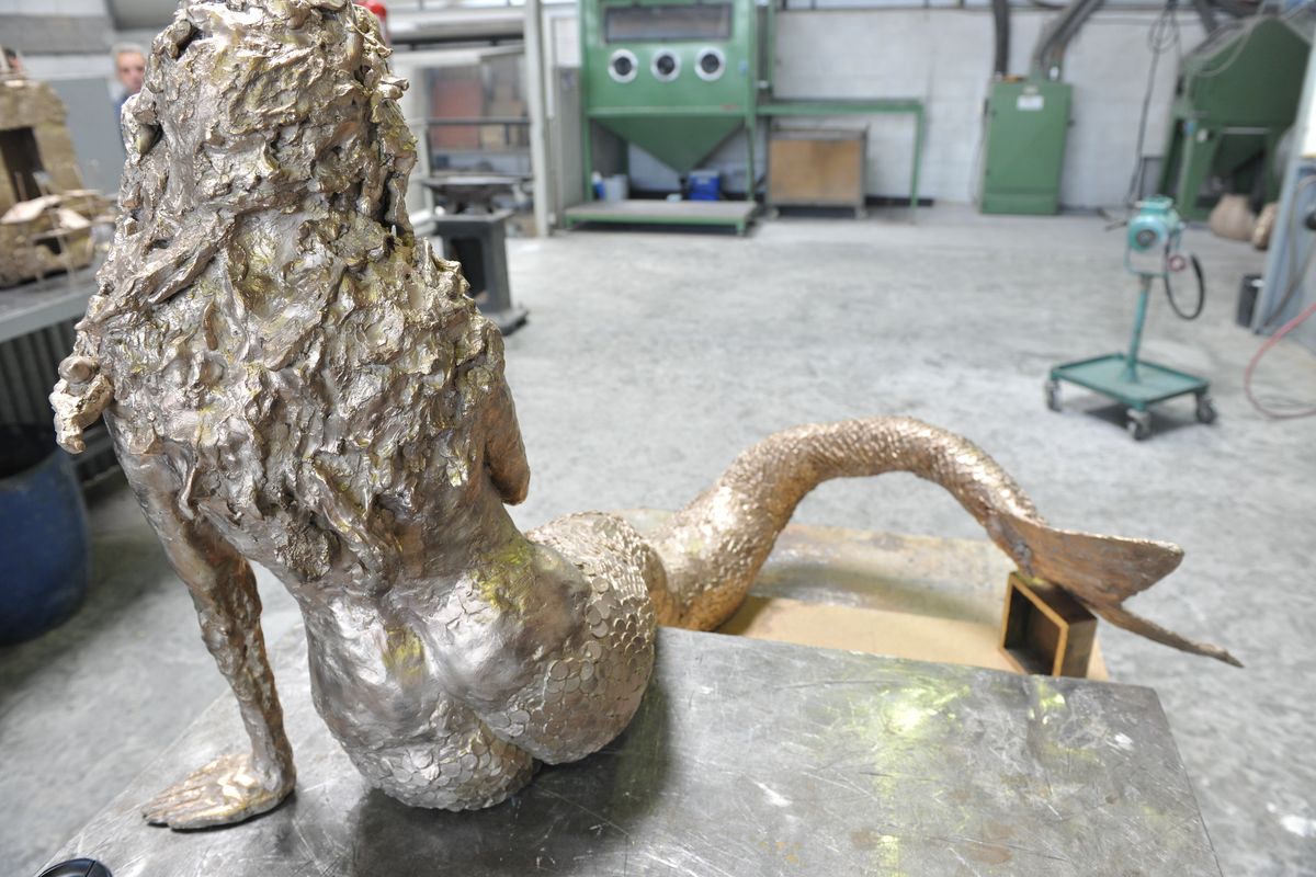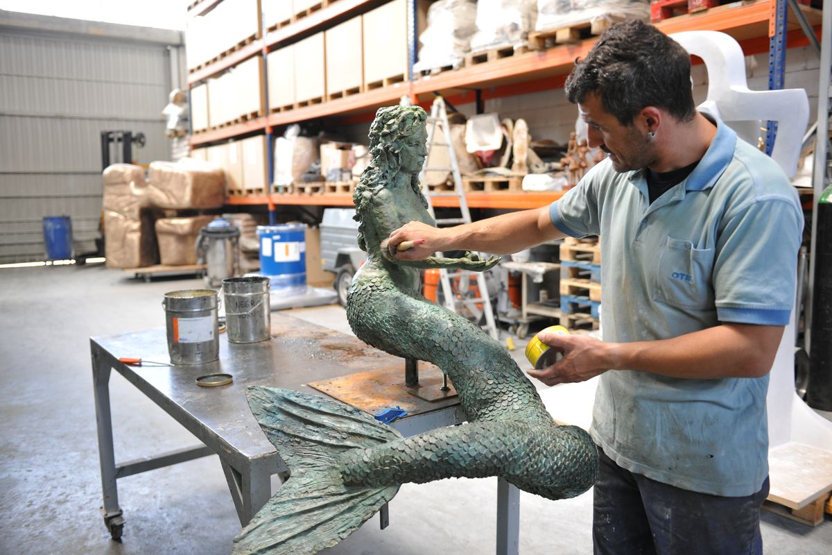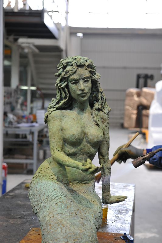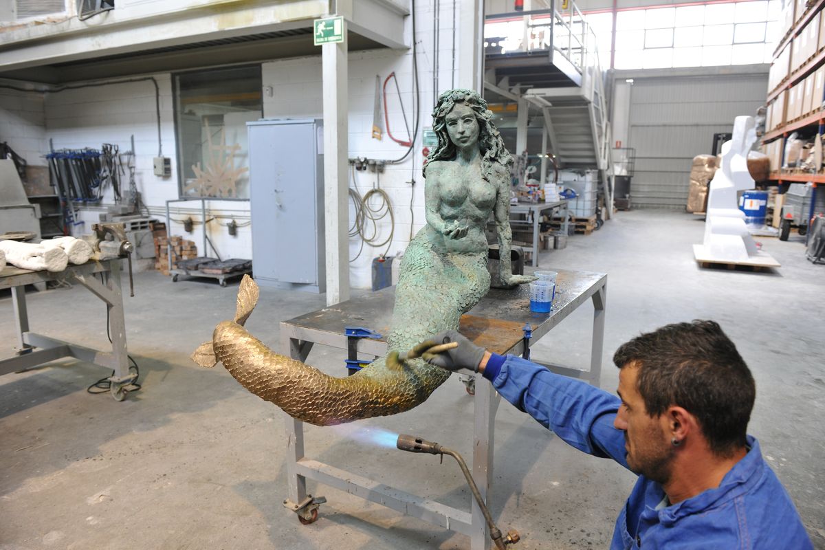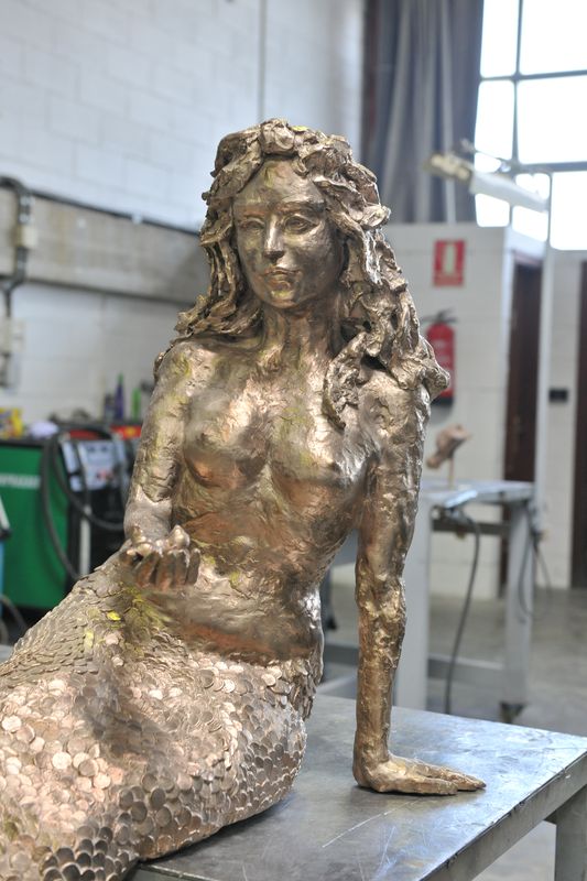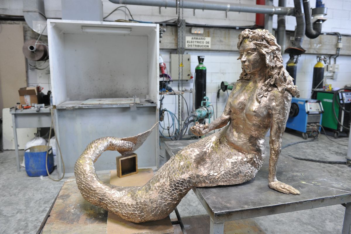 The sculpture begins as an original model, in which the overall form, movement, and proportions of the mermaid are developed. At this stage, the relationship between the body, the tail, and the gesture of the figure is gradually refined.