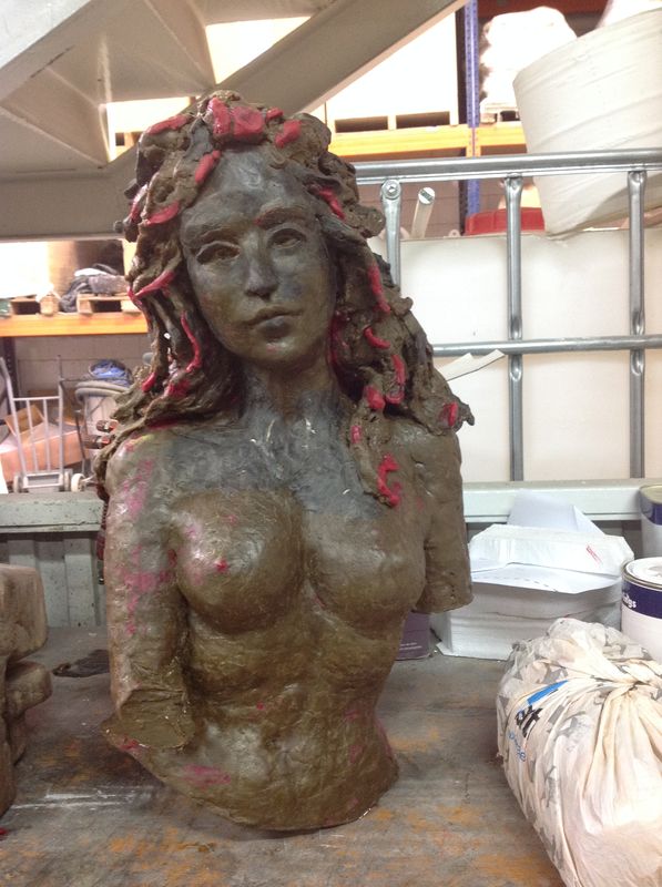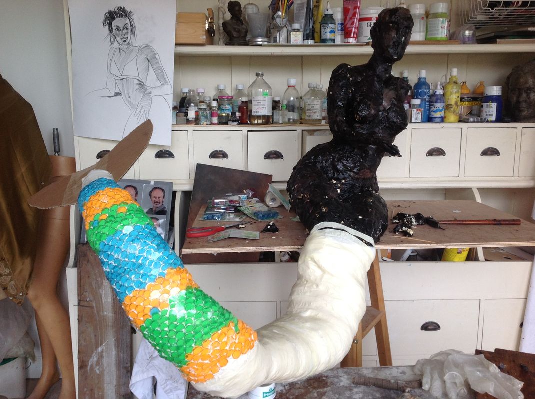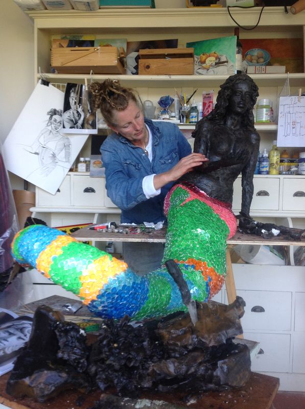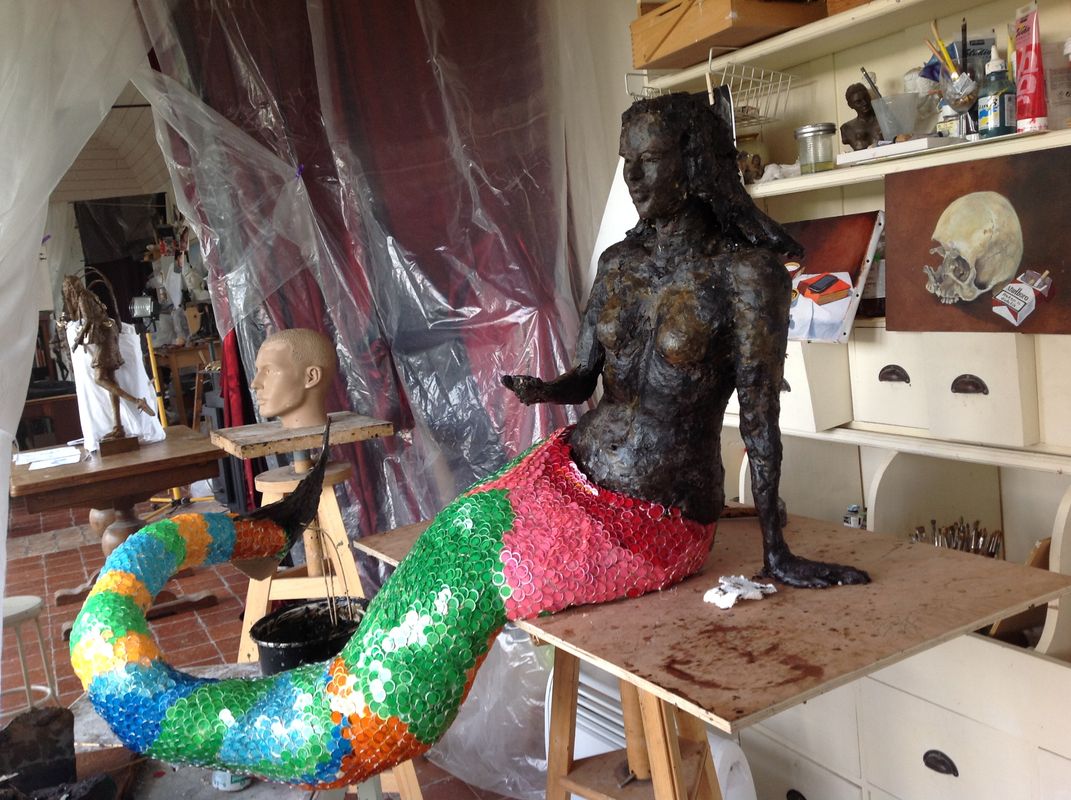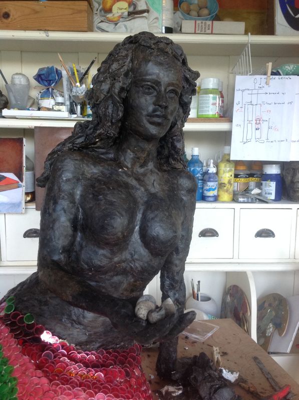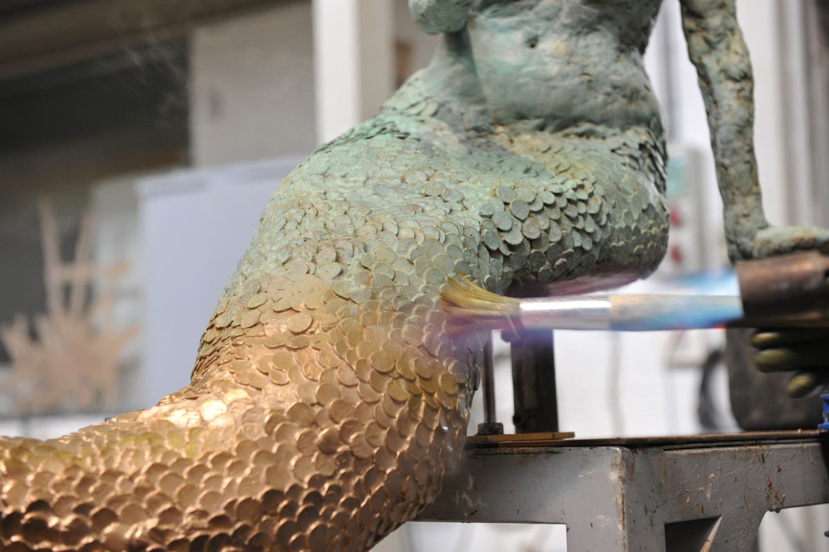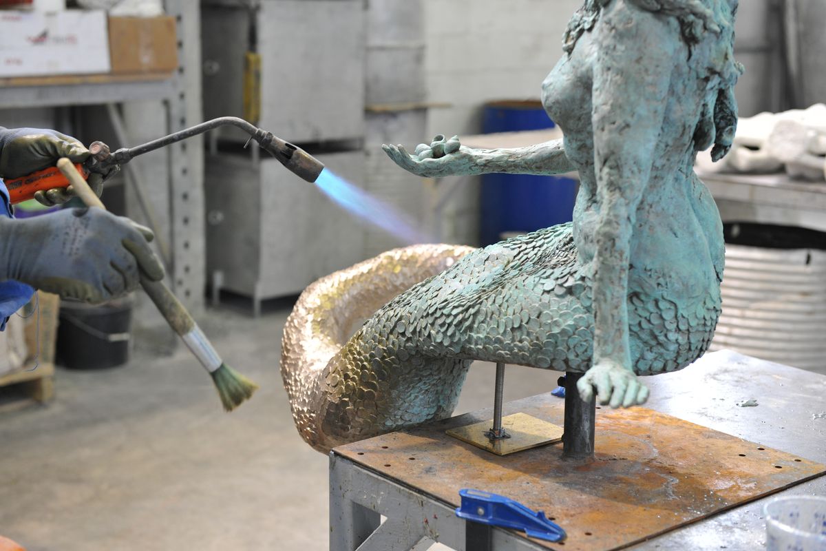 The sculpture begins as an original model, in which the overall form, movement, and proportions of the mermaid are developed. At this stage, the relationship between the body, the tail, and the gesture of the figure is gradually refined.